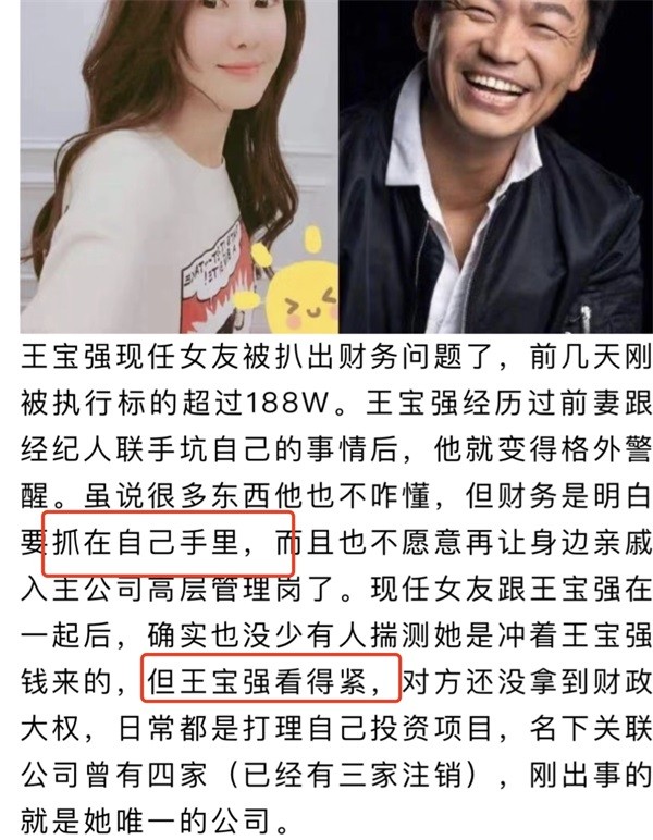 据爆料称,王宝强与冯清早已分手,而女方所欠的债务也并不止曝出的那一点,王宝强或许也会被冯清牵连。但爆料者并没有晒出实质性的证据,所以真实性还有待考证。