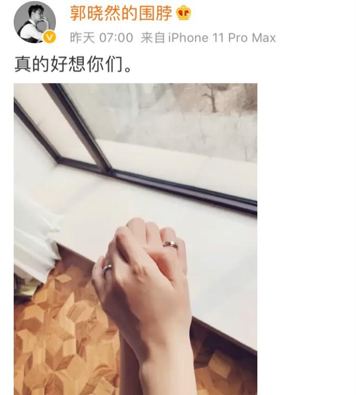 12月10日,王凯旗下公司男演员郭晓然在个人社交平台上发了一条“真的好想你们”动态,配图是一张两只戴着情侣戒指相互交握的手,甜蜜之情溢于屏幕。