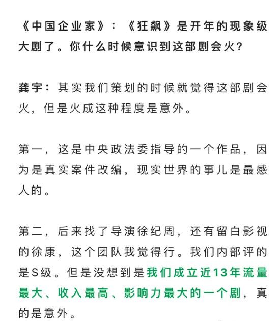 新浪娱乐讯 近日,创始人、首席执行官龚宇接受采访谈及《狂飙》他表示:" 其实我们策划的时候就觉得这部剧会火,但是火成这种程度是意外 "。他还称《狂飙》是爱奇艺成立近 13 年流量最大、收入最高、影响力最大的一个剧,真的是意外。