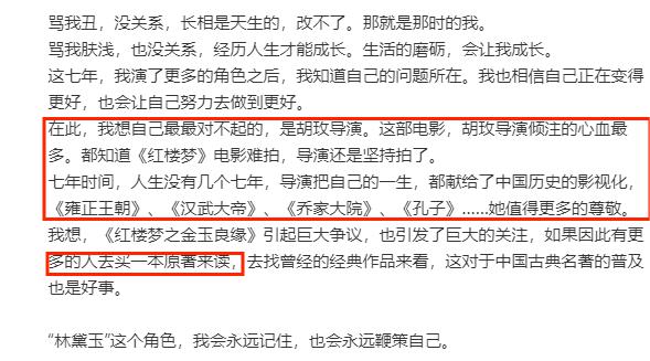 还有黛玉的演员,她所说的那段 " 倒回七年我还是会接这个角色 " 的话,我认为情有可原,甚至有些心疼她被人攻击外貌。