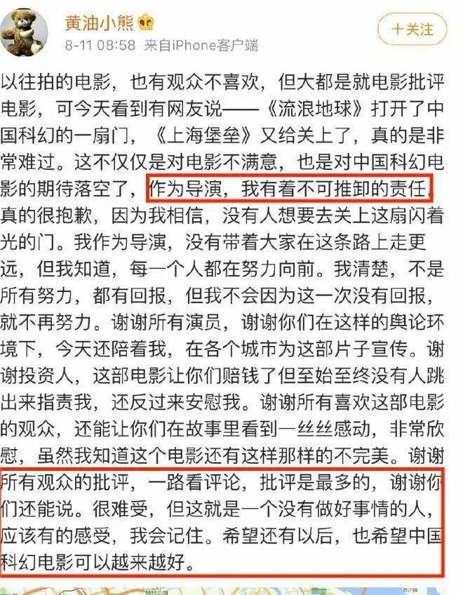 导演洋洋洒洒数千字长文,大意是哭诉自己的心酸委屈和不易,票房不理想是大陆的审查和资本的锅,我已经很努力了。