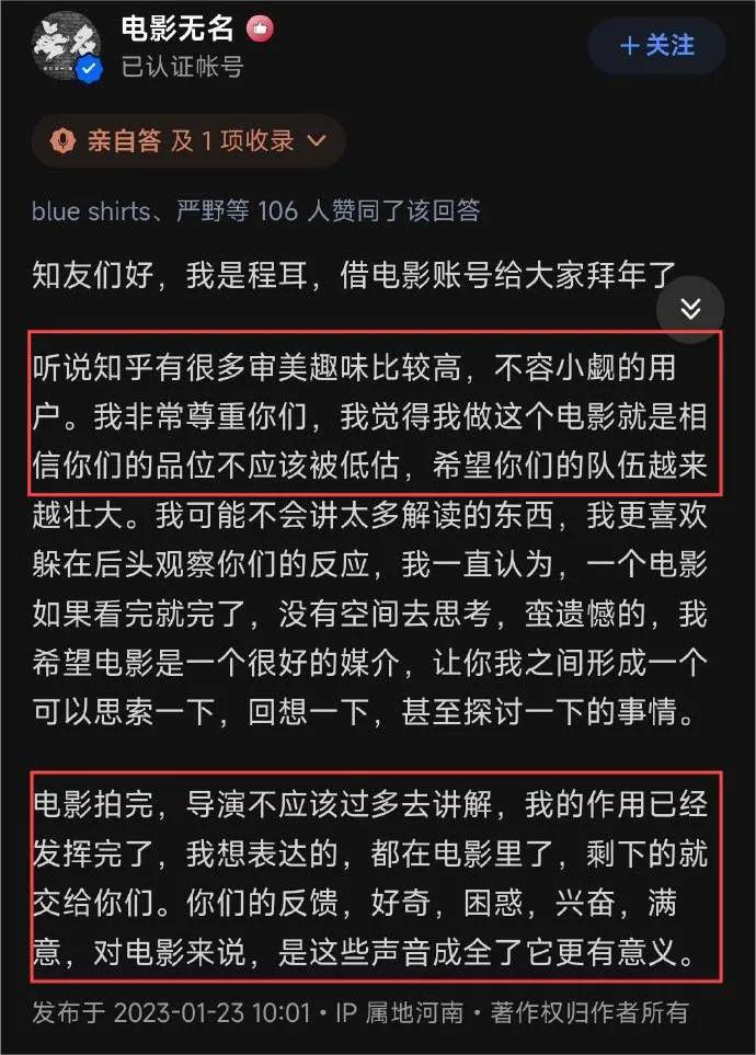 《无名》上线,程耳导演还特地跑到知乎发文。
