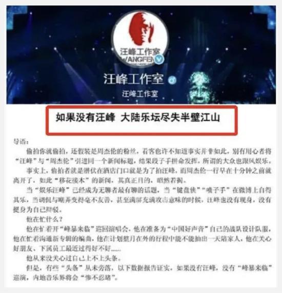 聊到汪峰老师这个傲气,咱就不得不提到他工作室发过的那篇雄文——《如果没有汪峰,大陆乐坛尽失半壁江山》。