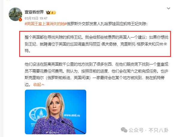 俄罗斯外交部发言人在嘲讽英国国防大臣的时候,说的是 " 凯特王妃到底怎么了?找到了吗?"