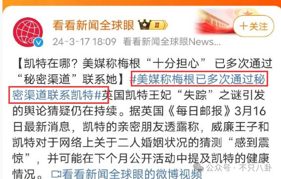 美国媒体说,凯特的妯娌,哈利王子的妻子梅根(两人已经脱离英国王室)也很担心凯特,已经多次通过秘密渠道联系凯特,但联系的具体情况没有报道。
