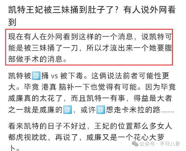 她做腹部手术,不是生病,很可能是被人捅了,而捅她的人是威廉王子的 " 小三 "。