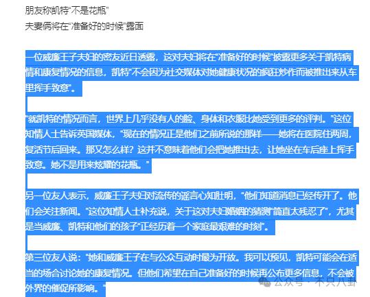再之后,凯特的朋友对着媒体发声了,其表示威廉和凯特将在 " 准备好的时候 " 披露更多关于凯特病情和康复的情况,他们知道外界关于凯特的传言,这对他们来说太残忍了。