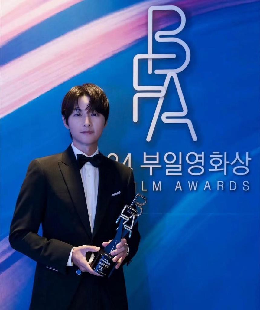 身穿一身黑色西装的宋仲基,搭配黑色领结,一点油腻感都没有,反而更显简单清爽,丝毫没有这个年龄阶段男演员的老态。