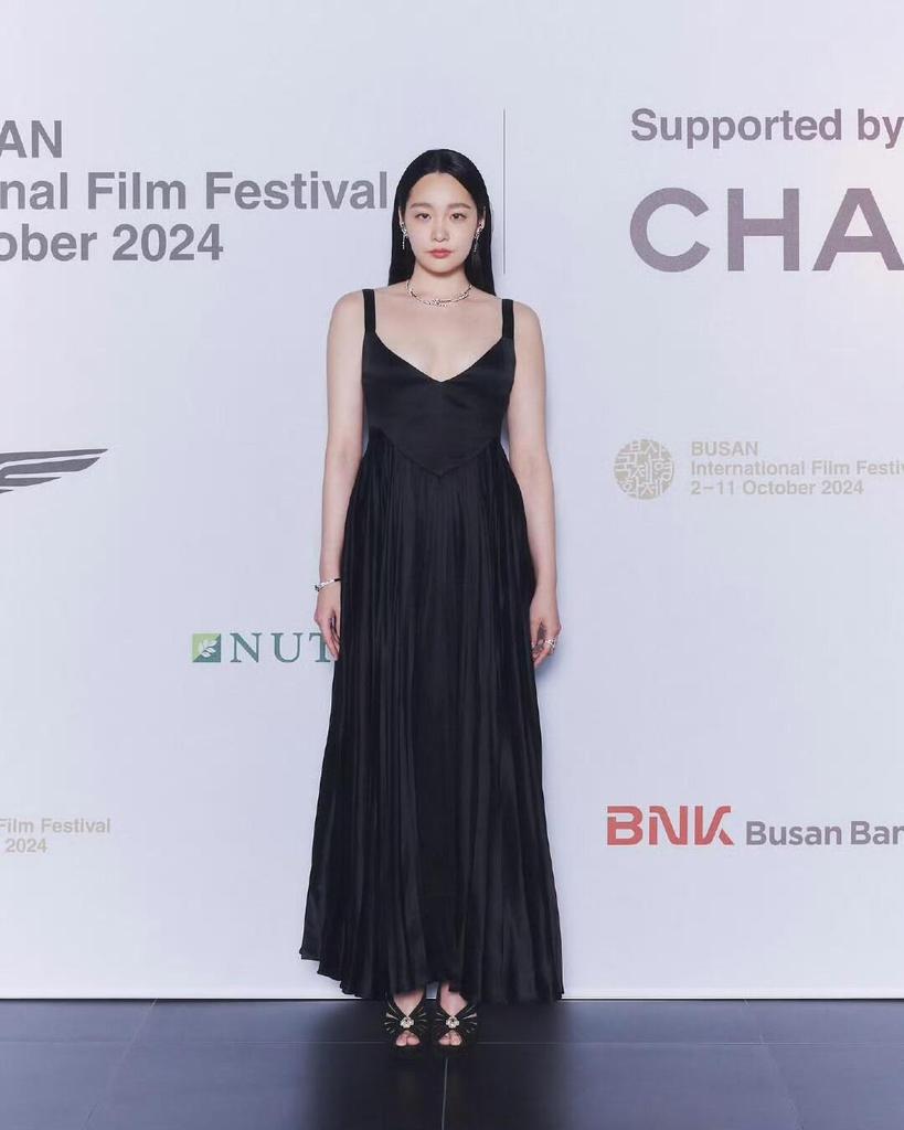 只不过裙子吊带加 V 领的设计,使得金敏荷视觉上的肩膀和胸口阔出去了不少,镜头下看起来会有身宽体胖的效果。