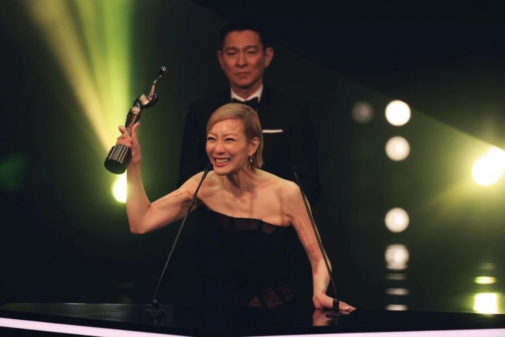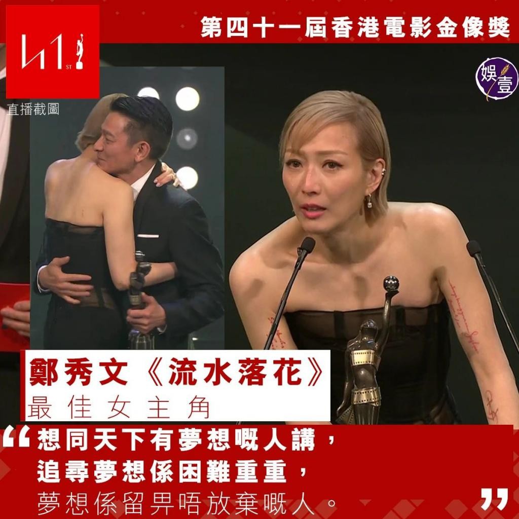 2025 年 4 月 16 日,郑秀文凭借《流水落花》首度成为香港电影金像奖影后,并由多年好友、搭档刘德华为她颁奖,Sammi 在后台接受媒体采访时说," 在华仔手里拿这个奖真的很有意义,因为在电影路上华仔帮了我很多,让我有很好的开始和发展,所以这个奖真的意义深重 " ▼