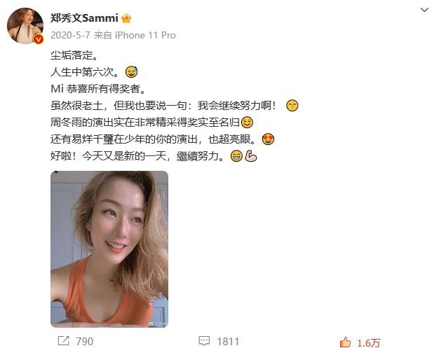 获奖之后她在 IG 上发文," 无论是歌手或演员的身份,永远要有破旧立新的勇气,绝对不要眷恋或停留在过去 "。也许对 Sammi 来说,拿到这个奖项的时候,它就已经成为了过去式了▼
