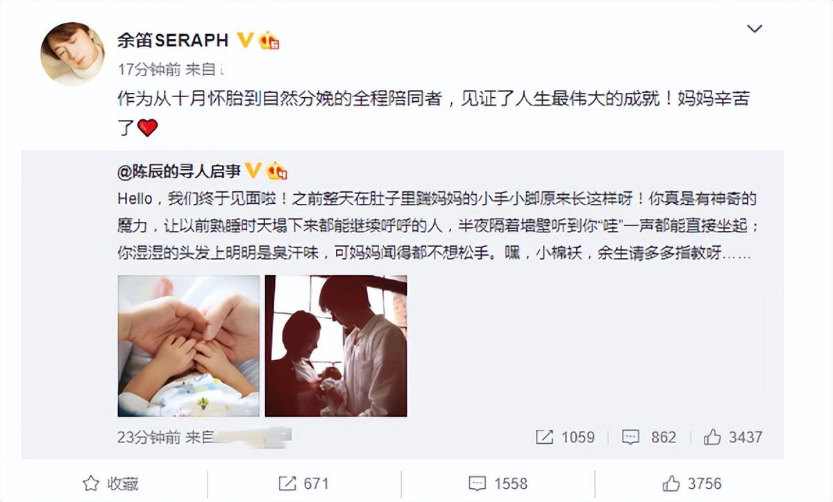 2020年8月5日,41岁的陈辰平安生女,发了动态告知粉丝。