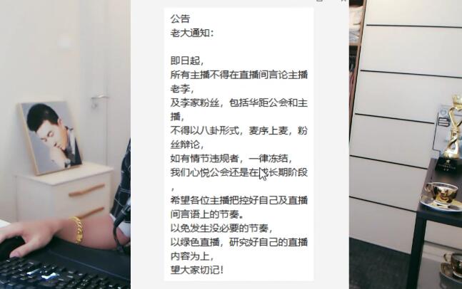 玄律开播表示自己经过了心悦公会的许可,公开了心悦公会刚发布的公告。透露公告上的“老大通知”指的并非是阿哲,而是心悦会长老七。公告的内容是,心悦旗下的主播不得去言论李先生以及李家粉丝,也包括华矩公会和华矩主播。如有情节严重者,一律冻结。