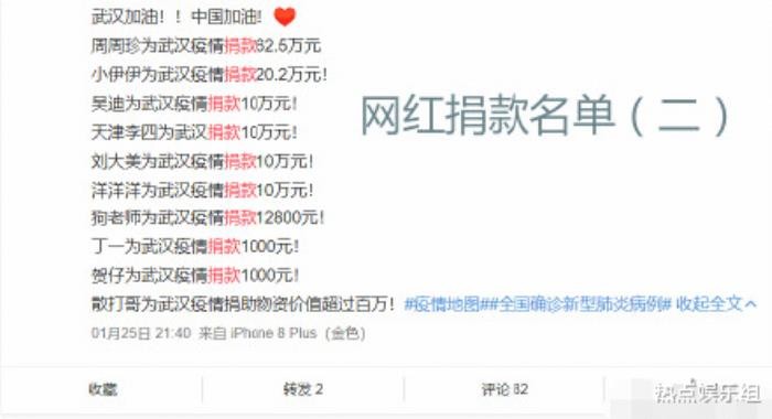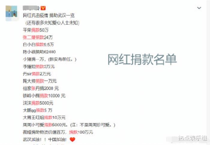 以上就是目前曝光出来捐款明星的名单,估计还有很多低调捐款并未曝光的明星,其实曝光不曝光都不重要,重要的是大家都在出钱出力为疫区加油助力,明星外网红也动了起来,并且辛巴是“一鸣惊人”。