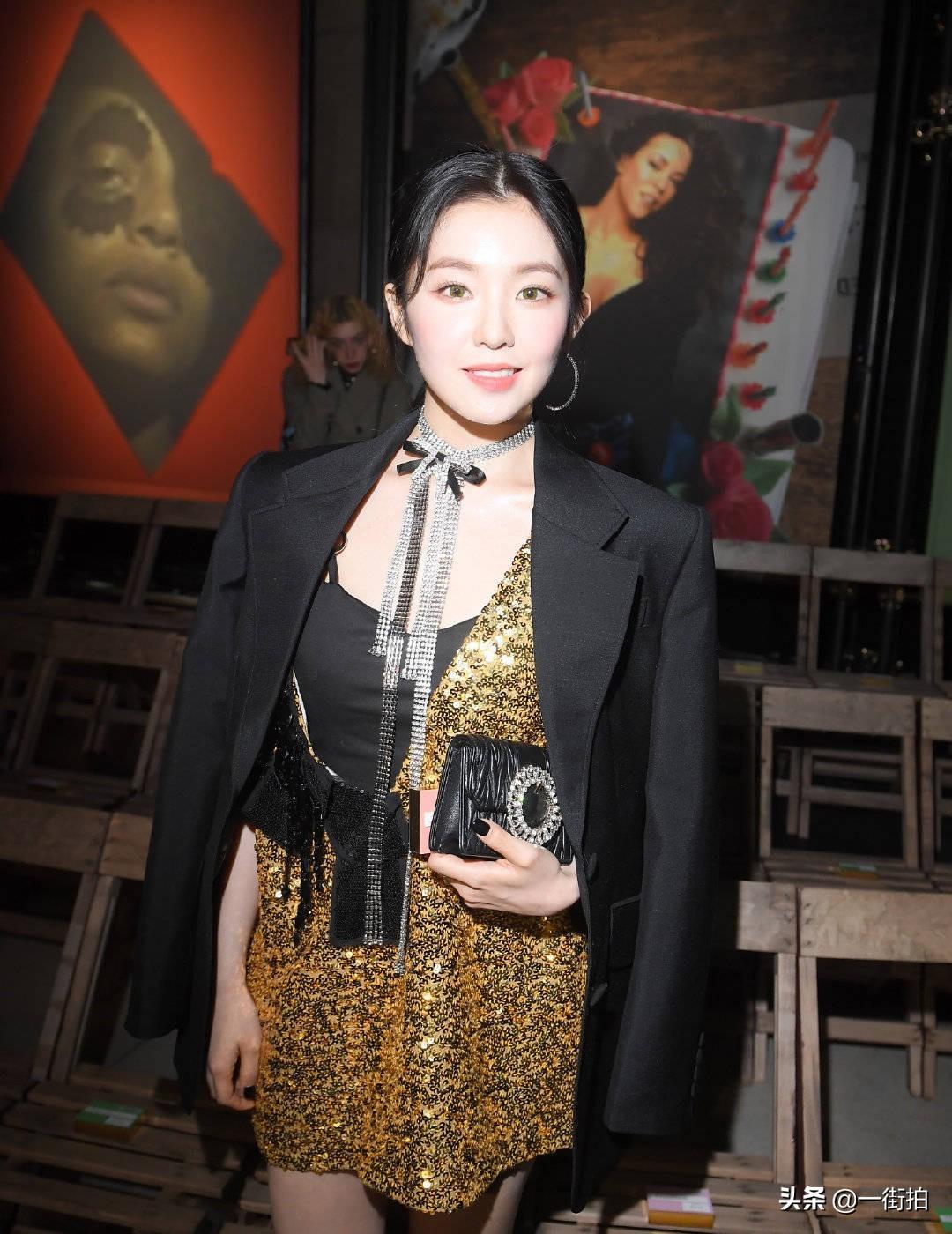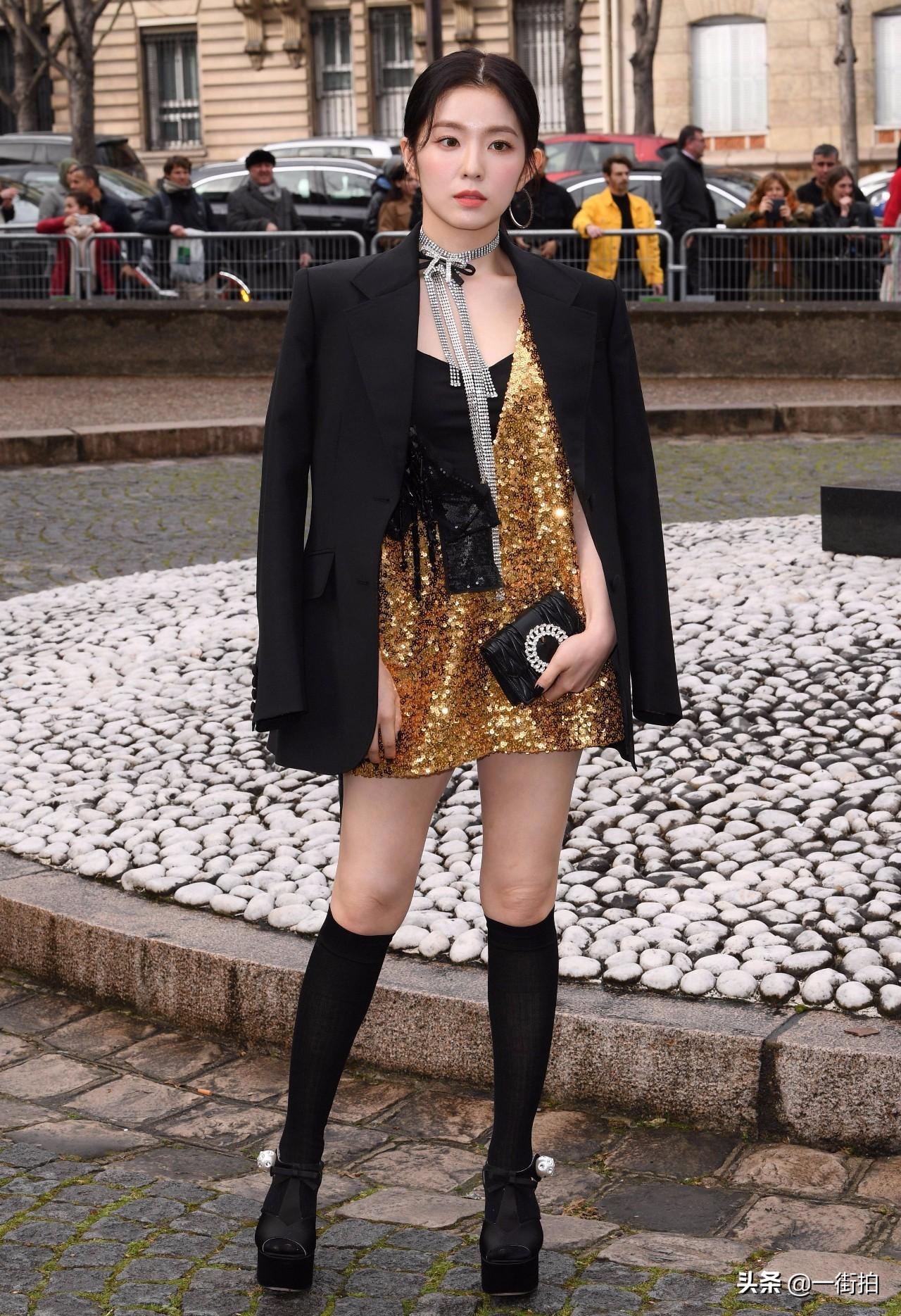 套选择了一件基本款的黑色西装,搭配金色的裙装直接就是下半身失踪的显高穿法。利落的西装剪裁可以增加气场,也很适合本身就有一些高冷气质的裴珠泫。