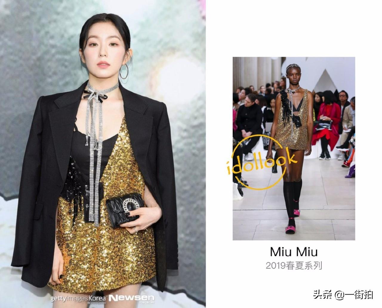 内搭了一件黑色的吊带,相比于模特选择的黑色内衣,吊带会比较的保守一些。毕竟身为女团还是不能太过于露骨性感,脖子上面的装饰非常有少女心,也很符合miumiu一贯的叛逆少女风,是小编我最喜欢的穿搭亮点。
