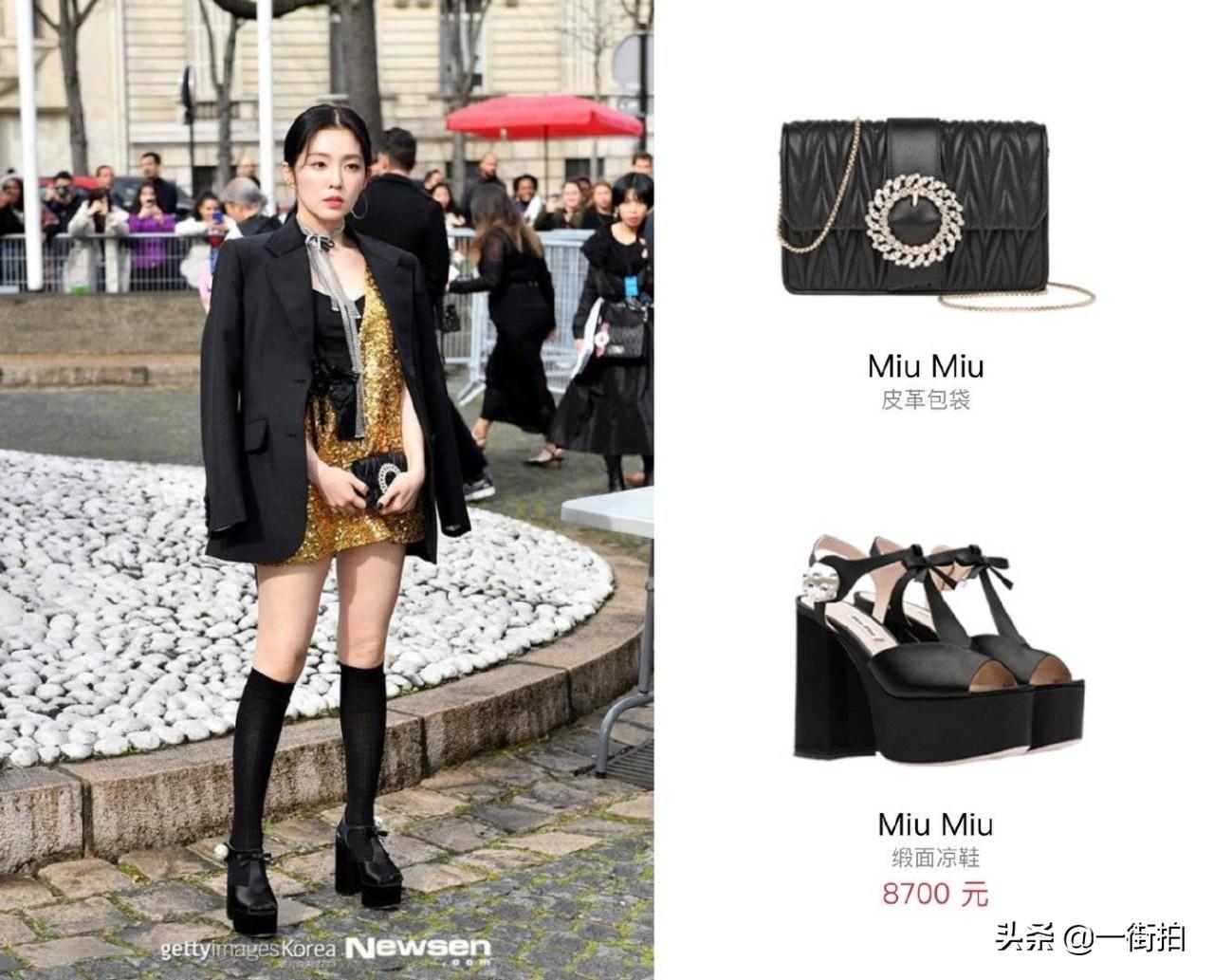 下装搭配了miumiu的鞋子跟包包,这种款式的松糕鞋简直就是小个子女生的救星,而且黑市黑色的。精致的绑带少女心满满。韩国女团经常会穿的袜子配高跟鞋这次裴珠泫也用到了,洛丽塔的少女风。