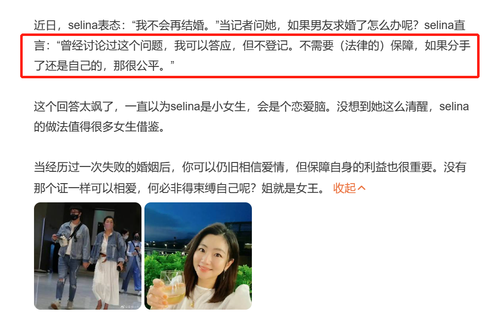 对于未婚先孕这件事,Selina早就在采访中表示,面对爱情她可以很勇敢,但在婚姻面前,她还是没有办法接受,虽然能接受求婚,但是不可以登记。