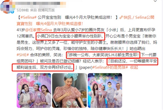 2025年3月,Selina与男友被拍到牵手,随后大方承认了这段恋情,只不过男方的真实身份始终是个谜团。如今Selina未婚先孕又透露出是男孩,难道男方是富豪家庭?需要男孩来传宗接代不成?