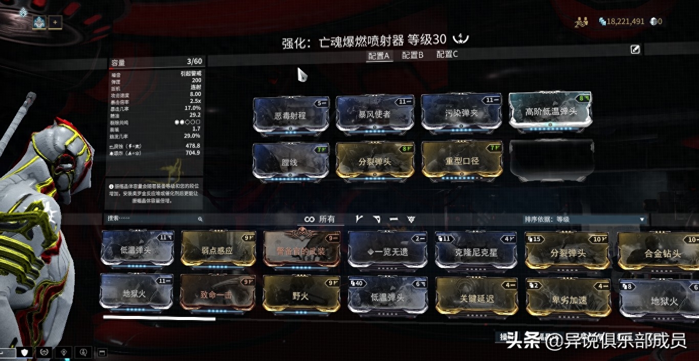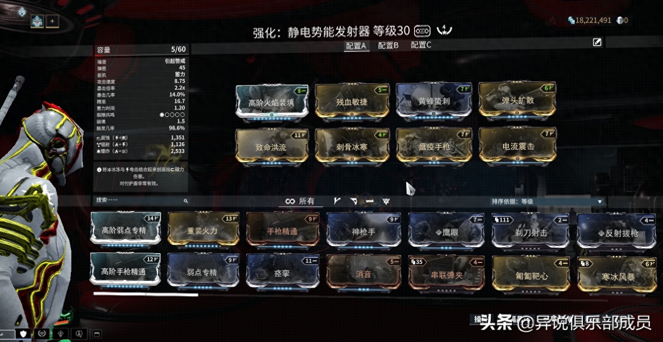 那么这么吊炸天的武器该怎么配卡呢?高阶火焰装填、残血敏捷、黄蜂蛰刺、弹头扩散、致命洪流、刺骨冰寒、瘟疫手枪、电流震击(只要4极化就可以毕业,是不是很划算)。