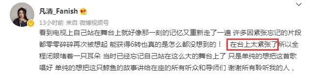事后,凡清第一时间在社交网贴文谦虚称“看到电视上自己站在舞台上就好像那一刻的记忆又重新走了一遍,许多因紧张忘记的片段都零零碎碎再次被想起,能获得6转也真的是怎么都没想到的,因为自己在台上太紧张了”!尽管临场发挥有点紧张,但众多观众纷纷表示“她好会用歌声讲故事,不仅会唱而且会作曲,多才多艺”!