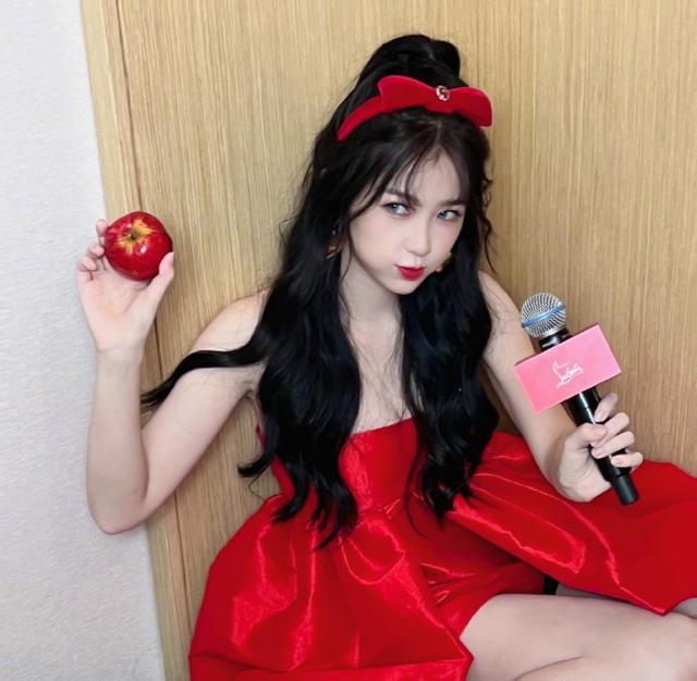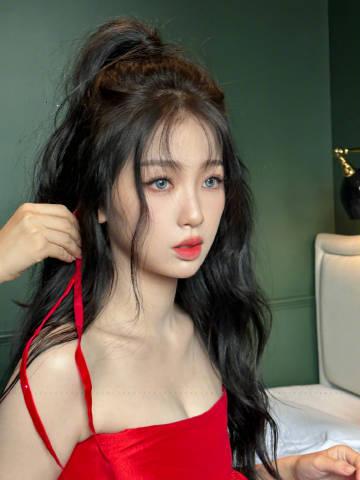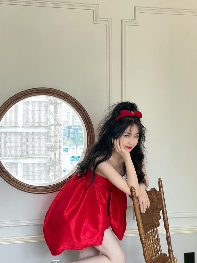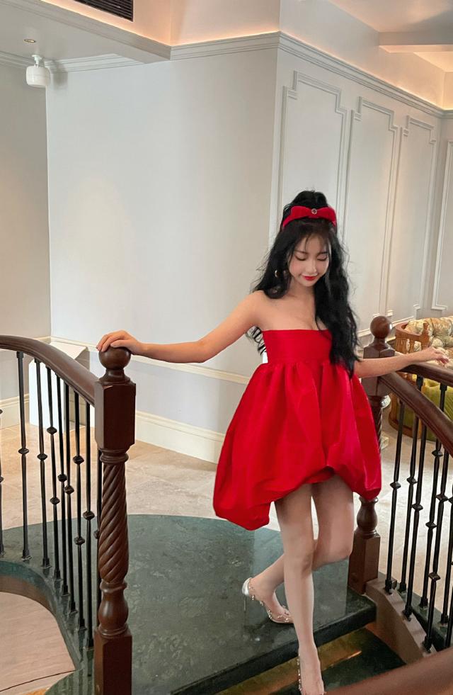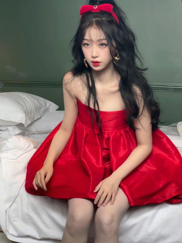 虞书欣晒近期穿搭 look 红色抹胸裙秀香肩锁骨