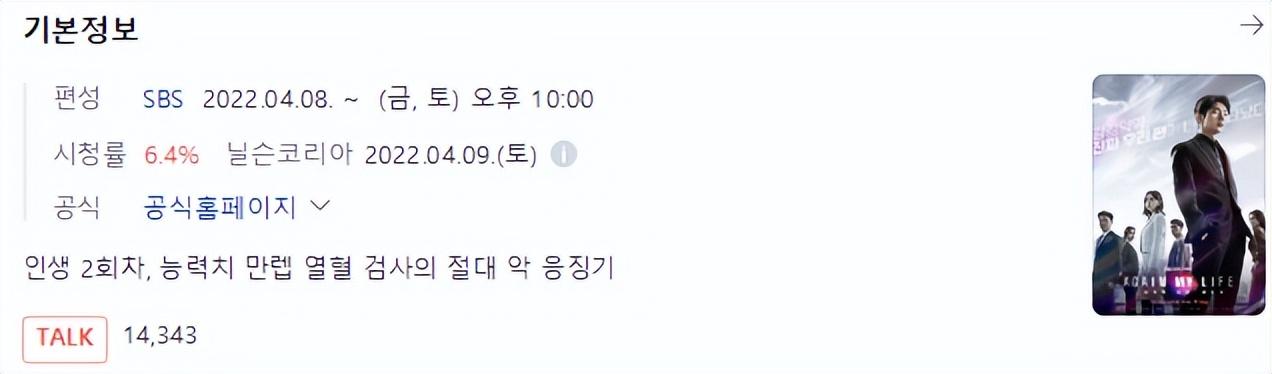 2025年4月8日,SBS推出了一部新剧《再次我的人生》,一上线就收视火爆,第一集的收视率就冲上5.8%。