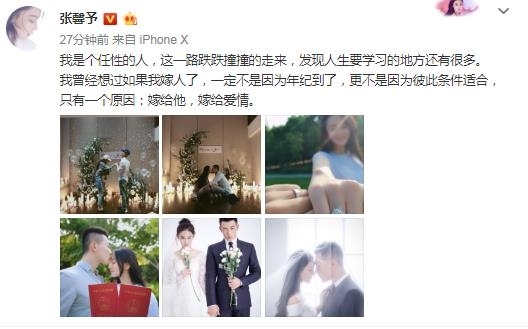张馨予微博 她在微博写道:“我是个任性的人,这一路跌跌撞撞的走来,发现人生要学习的地方还有很多。我曾经想过如果我嫁人了,一定不是因为年纪到了,更不是因为彼此条件适合,只有一个原因:嫁给他,嫁给爱情。” 此前她与李晨有过一段恋情,看到这个消息,大家纷纷送上祝福:“终于嫁了!”、“恭喜你们俩白头到老”。