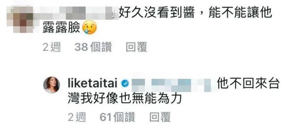 曾有粉丝留言表示想看理科先生,但理科太太直接回应先生不回台湾。(翻摄脸书)