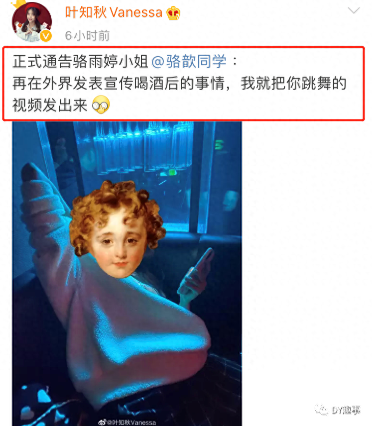 4月28日,叶知秋在微博上发帖:正式通告骆雨婷小姐(骆歆)再在外界发表宣传喝酒后的事情,我就把你跳舞的视频发出来