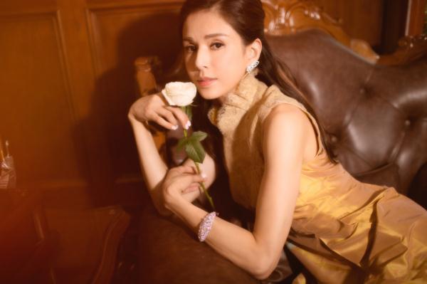 李若彤搭配了一头披肩的卷发,恬静又淑女,精致的妆容,粉嫩的红唇点缀,甜美的少女味十足,造型别致的耳环装饰,与手臂上的手链相呼应,奢华又矜贵,李若彤眼神中写满了故事,站在古老的扶梯上。