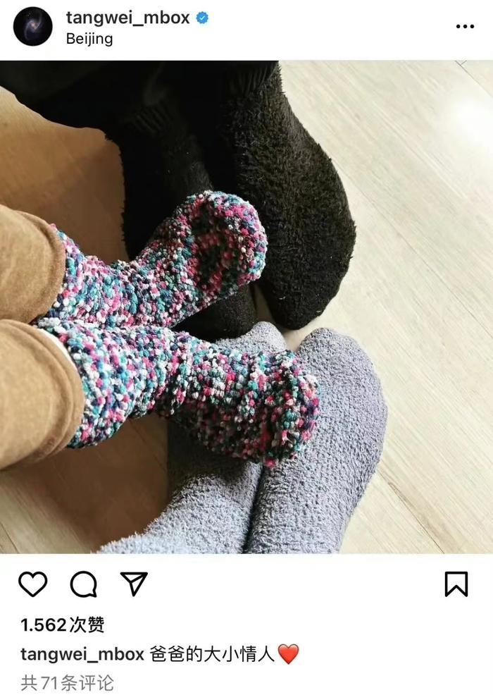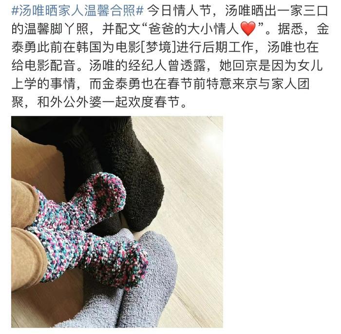 情人节成为了很多已婚或者有另一半的明星秀恩爱的时候,一向低调的汤唯在社交平台晒出了一家三口的合照,配文是:“爸爸的大小情人”。一家三口穿着绒袜入镜,女儿的花色小袜子显得尤为可爱。虽然脸部没有出镜,不过大家都看出了她有多幸福。
