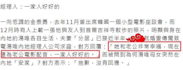 媒体迅速联系了汤唯公司,经纪人否认了夫妻婚姻状况有问题,“一家人好好的”,还指出汤唯和老公非常幸福,汤唯正在为老公的电影配音。当问到汤唯母女为何在内地定居时,经纪人就拒绝回应了。