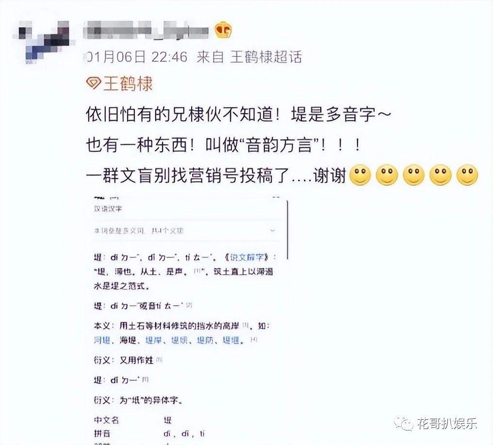 这边王鹤棣还没说什么,粉丝先坐不住了,从各个方面狡辩想要为偶像澄清,有一个粉丝说,这个字本来就是多音字,以此来说明王鹤棣没有错,然而看着这位粉丝的澄清,网友们简直啼笑皆非,还有热心网友补充道," 河堤 " 这个词组只有唯一读音,甚至连着粉丝一起嘲笑,说没文化的明星才会吸引没文化的粉丝。