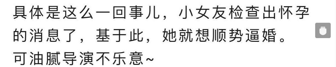 根据爆料,这位导演的年轻女友在怀孕后希望结婚,但导演却冷酷地拒绝了她,即使她怀着孩子也无法让导演同意婚礼。而这一切的原因似乎相当简单,因为导演曾经让女友去陪圈内一些大佬喝酒,以换取资源,这种私下的交易让导演对孩子的亲缘产生怀疑。更糟糕的是,导演不仅不愿意承认这段感情,还试图以“情感不干净”为借口,提出和女友分手。