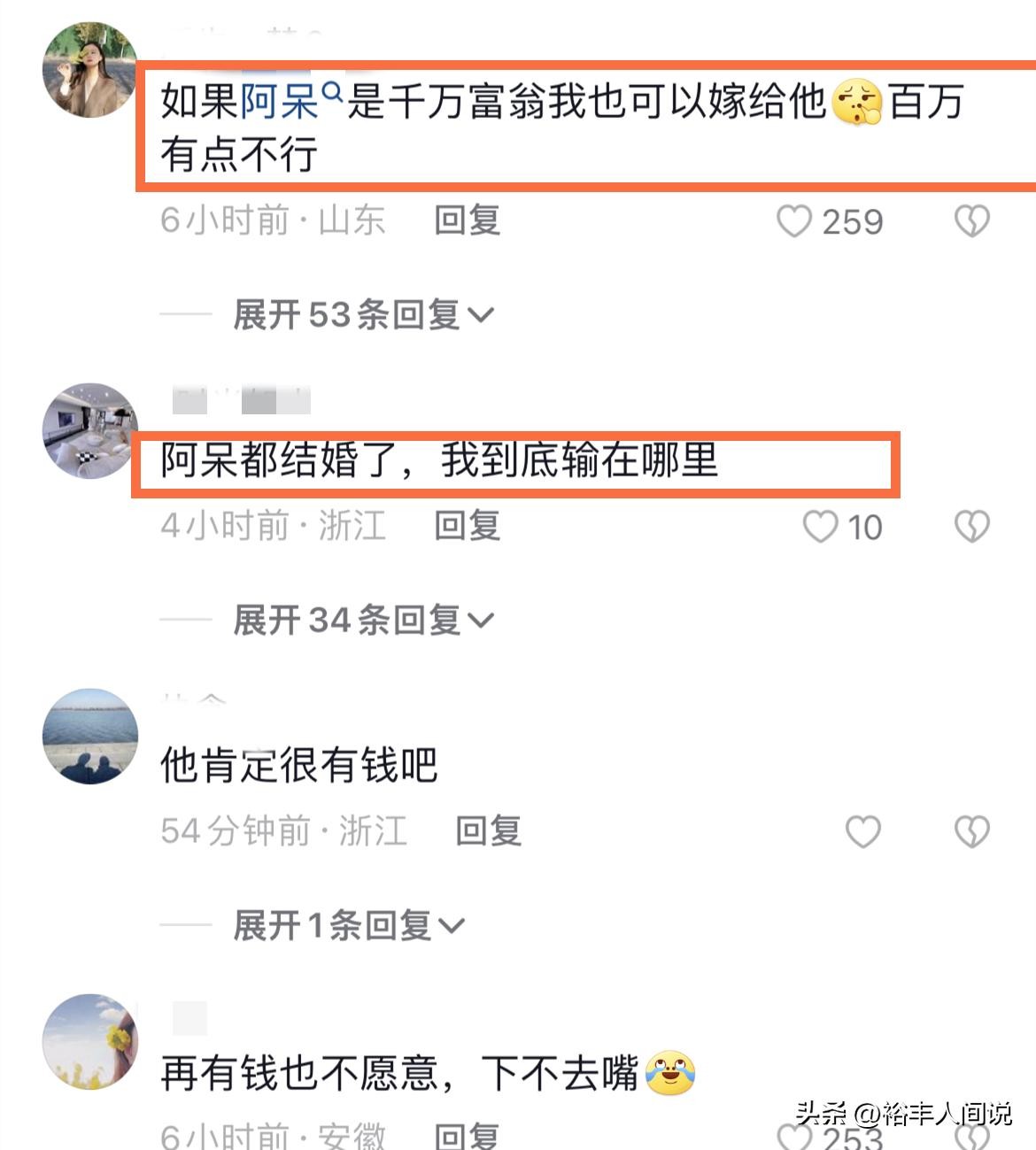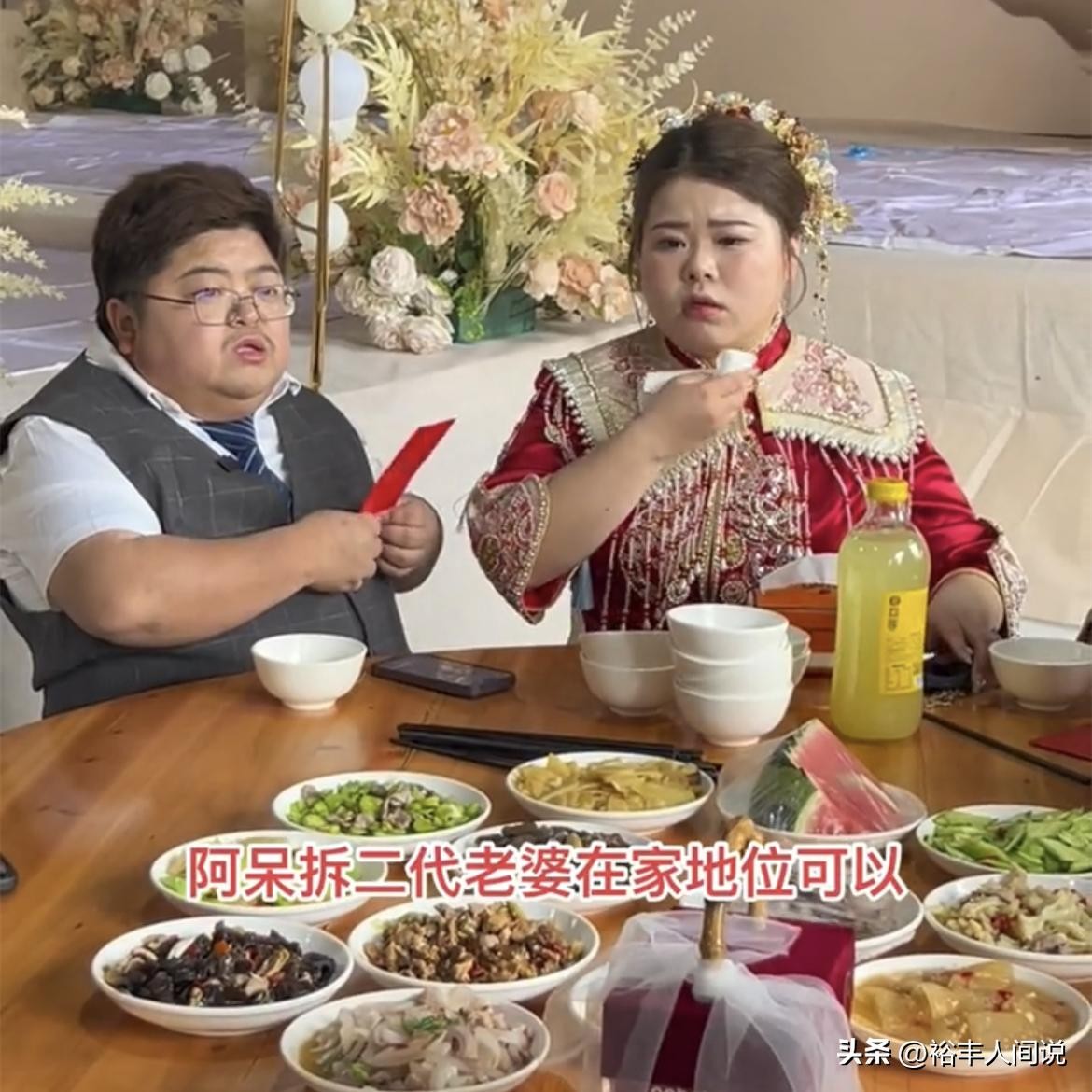 虽说整场婚礼的花费很大(婚车用的是百万级别的),但酒席属实有些太寒酸。不过阿呆对妻子真的很疼爱,举行婚礼之前,两人坐在一起休息,阿呆则拿着红包为其扇风解暑。