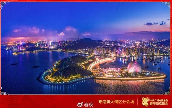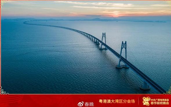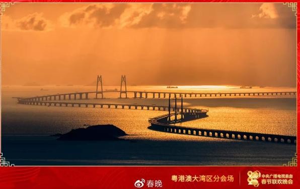 粤港澳大湾区分会场取景港珠澳大桥白海豚岛,融合大湾区人文精神和文化特色,展示大湾区发展成果,呈现流光溢彩的湾区城市群像,描绘出粤港澳三地共迎新春、大湾区同创未来的盛世图景,充分彰显粤港澳大湾区加快建设富有活力和国际竞争力的一流湾区和世界级城市群的美好前景。