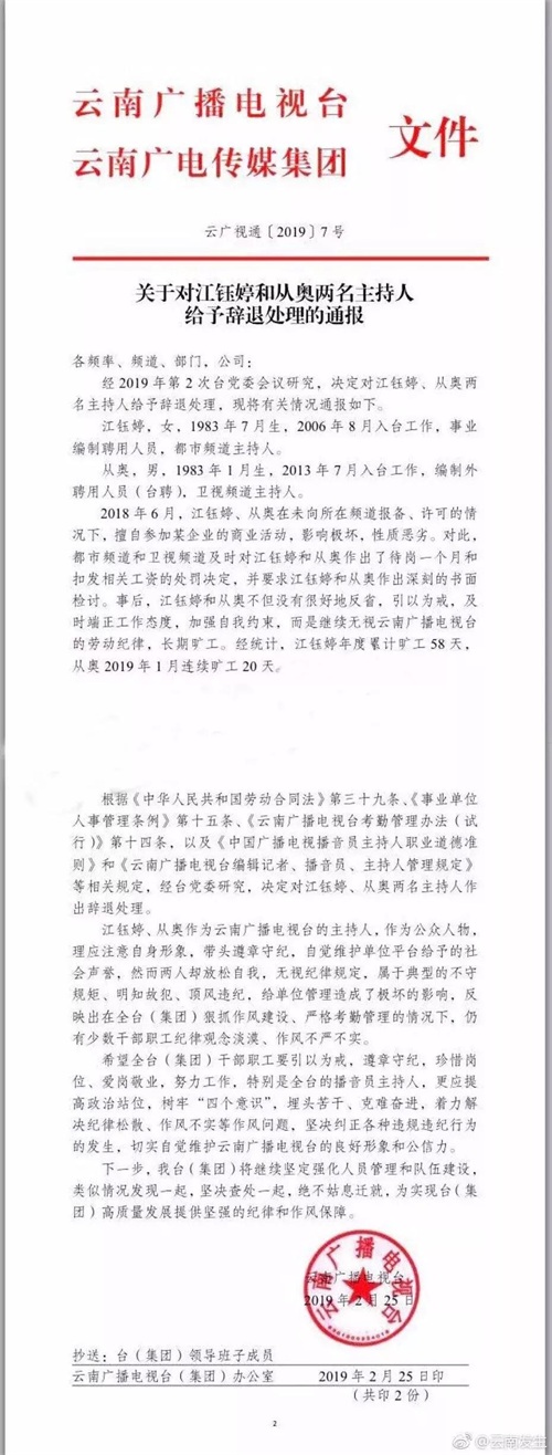 关于对江钰婷和从奥两名主持人给予辞退处理的通报