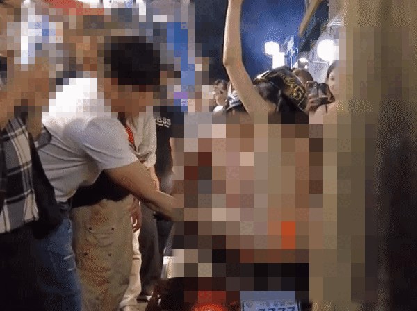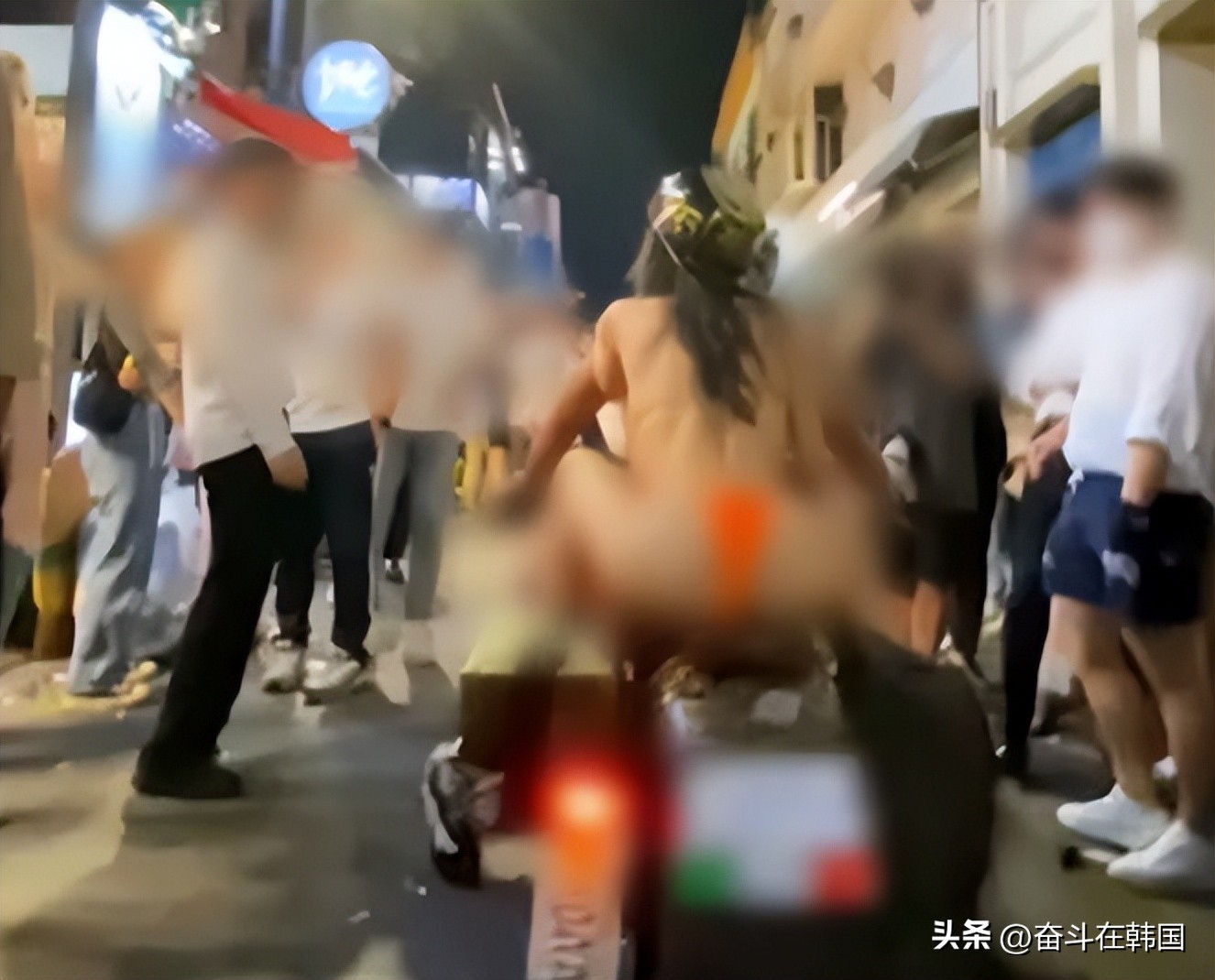 在梨泰院街头,比基尼女热情地和街边的路人进行互动,甚至还有路人直接伸手拍打了比基尼女裸露在外的屁股以及戴着头盔的头部。