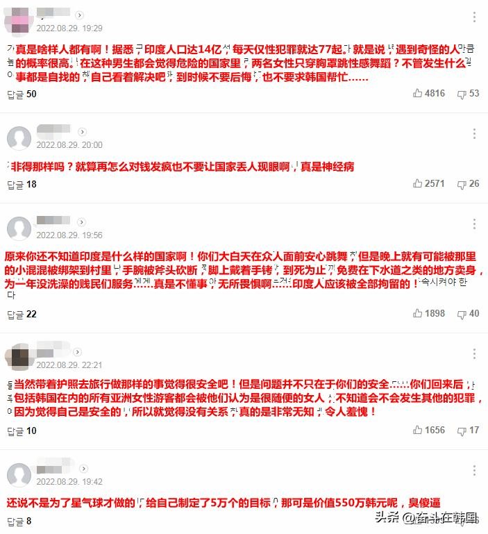 韩国网友们留言表示:“印度真的不是适合女性们旅行的地方,没必要为了赚钱去那里”、“在印度一旦有人起了强奸的念头,大家会一起扑过来,那时候她俩就完了”、“星气球算什么啊,有必要做到这种程度吗”、“不管发生什么,千万不要向韩国求救,真是给韩国丢人”……