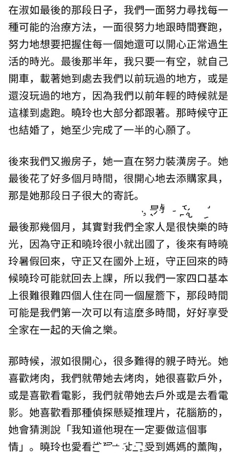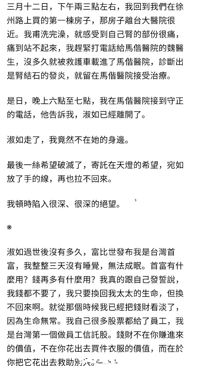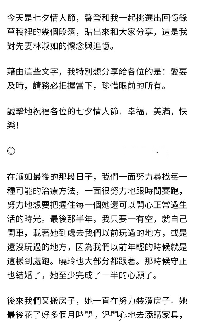 郭台铭还表示通过这些文字特别想分享给各位的是:爱要及时,请移必把握常下,珍惜眼前的所有。诚挚地祝福各位的七夕情人节,幸福,美满快乐!随后郭台铭就晒出他和前妻的点点滴滴。他表示在前妻林淑如最后的日子里,他只要有时间就会陪伴妻子,还不忘记想尽一切可能的办法治疗妻子,当然了郭台铭也会陪伴妻子去他们没有玩过的地方。他还表示他们的女儿已经结婚了,也满足了她一半的心愿。
