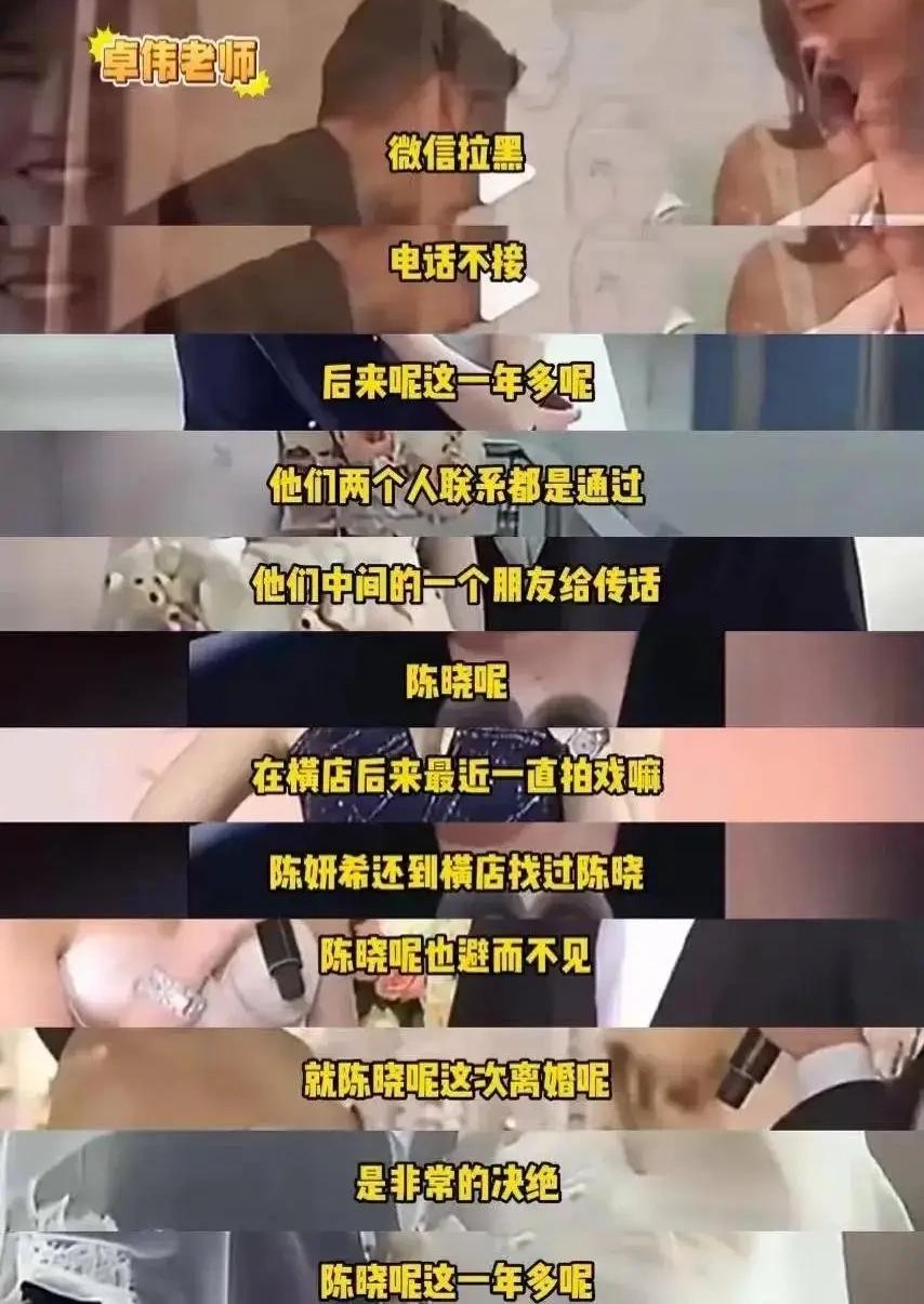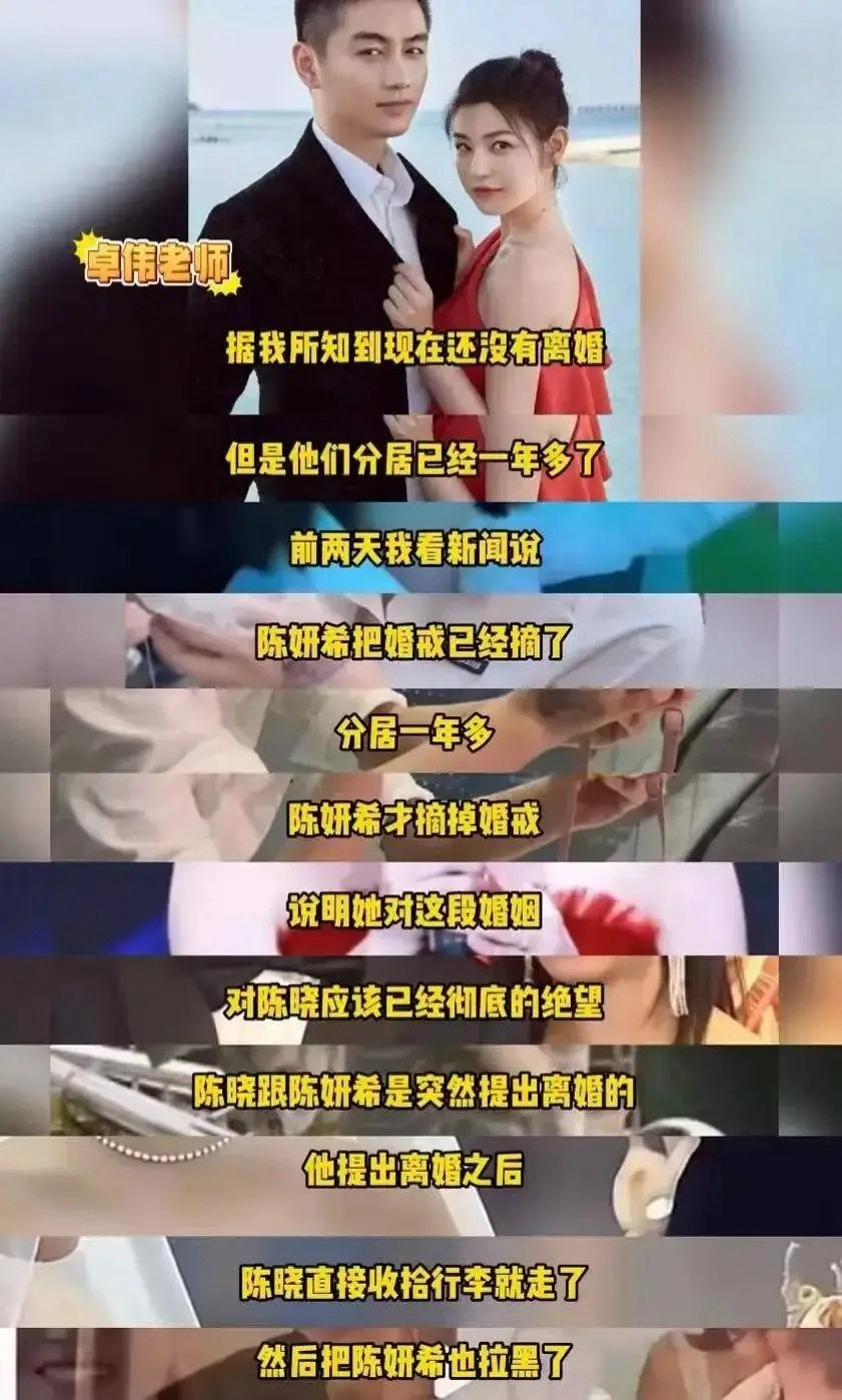 但近年来,关于他们婚变的传言却层出不穷。先是大陆知名狗仔江小宴直播爆料称,两人的婚姻去年年底就已破裂,随后又有“内地第一狗仔”卓伟透露,陈晓和陈妍希已经分居一年多,甚至陈妍希已摘下婚戒,对这段婚姻似乎已彻底绝望。更有传言称,陈晓提出离婚后,直接收拾行李离开,并将陈妍希拉黑,两人之间的联系只能通过中间人传话。这些传言虽然未经证实,但却让粉丝们对他们的婚姻状况担忧不已。