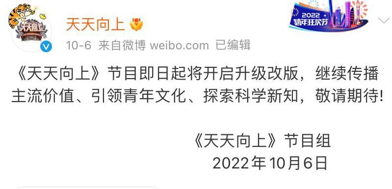在《快乐大本营》宣布改版停播后,没想到《天天向上》也迎来了这一天,10月6日晚,《天天向上》官微就发文官宣称将停播,表示即日起将开启升级改版,继续传播主流价值、引领青年文化、探索科学新知,敬请期待。