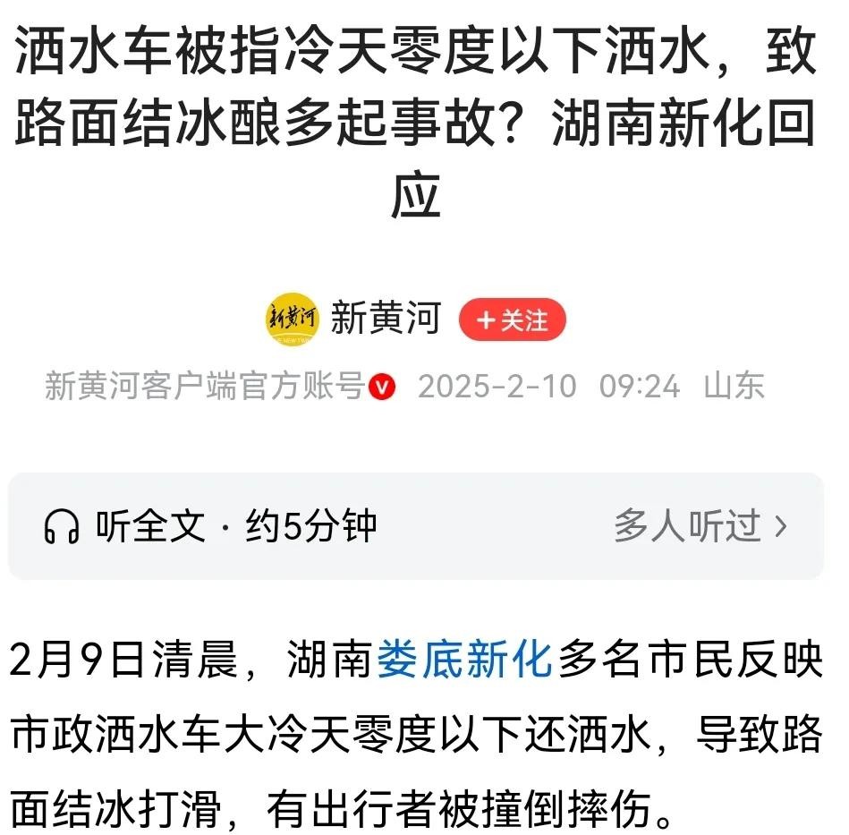 就在半个月前,湖南娄底新化还曾因为洒水路面结冰一事上了热搜,很多网友反映洒水车过后,路面结冰,不仅出现了多起事故,甚至行人经过都容易摔倒。