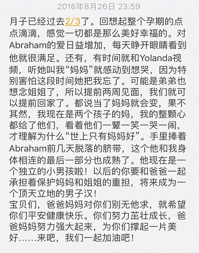 第一次是在2015年,她有了女儿,在文中她说自己义无反顾地爱着老公,希望女儿能健康快乐地成长。