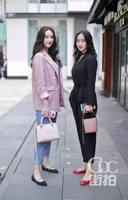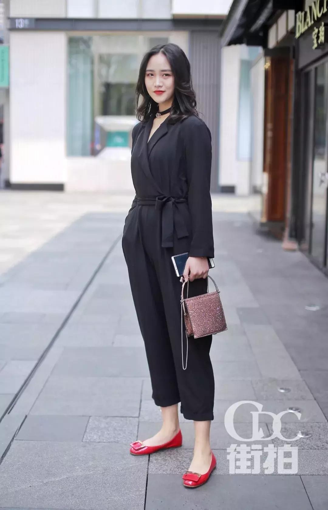 右边小姐姐黑色的连体装体现职场女性的干练,红色平底鞋和blingbling的包包十分的吸睛,博人眼球。