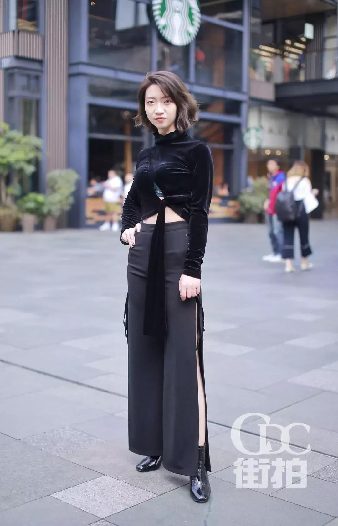 黑色金丝绒材质高腰上衣,尽显小姐姐姣好的身材,再搭配高开叉的阔腿裤,加上一双方头的皮高跟鞋,个性又性感。