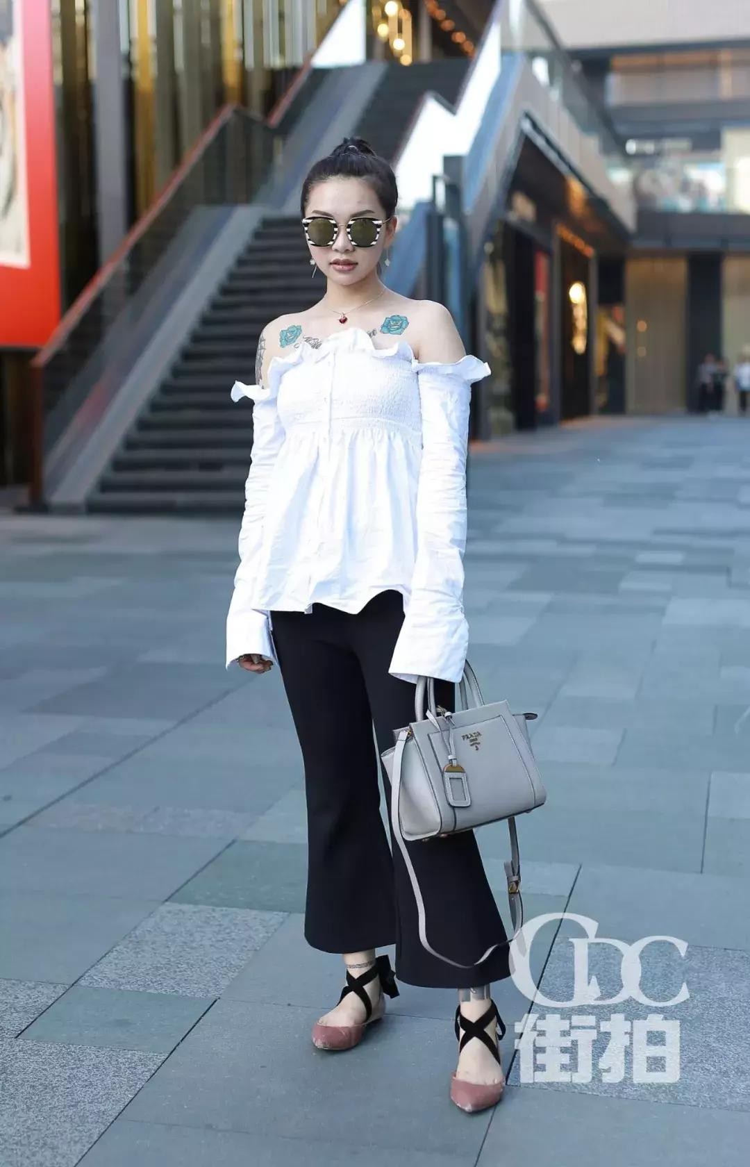 白色性感的露肩衬衫刚好露出个性的纹身,搭配修身的黑色阔腿裤,配上舒适好看的玫瑰干枯粉色的绑带鞋,彰显都市丽人的优雅风。