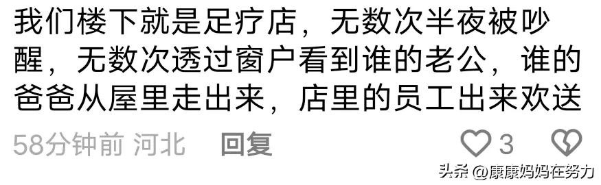楼下足疗店,半夜总能被吵闹声吵醒,无数次透过窗户看谁的老公,谁的爸爸从那走出来