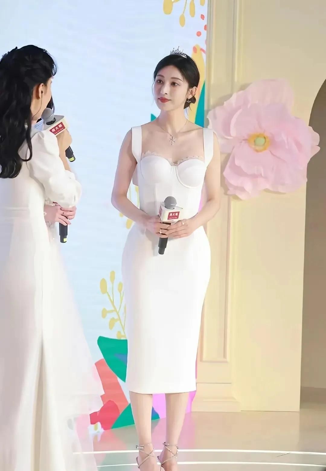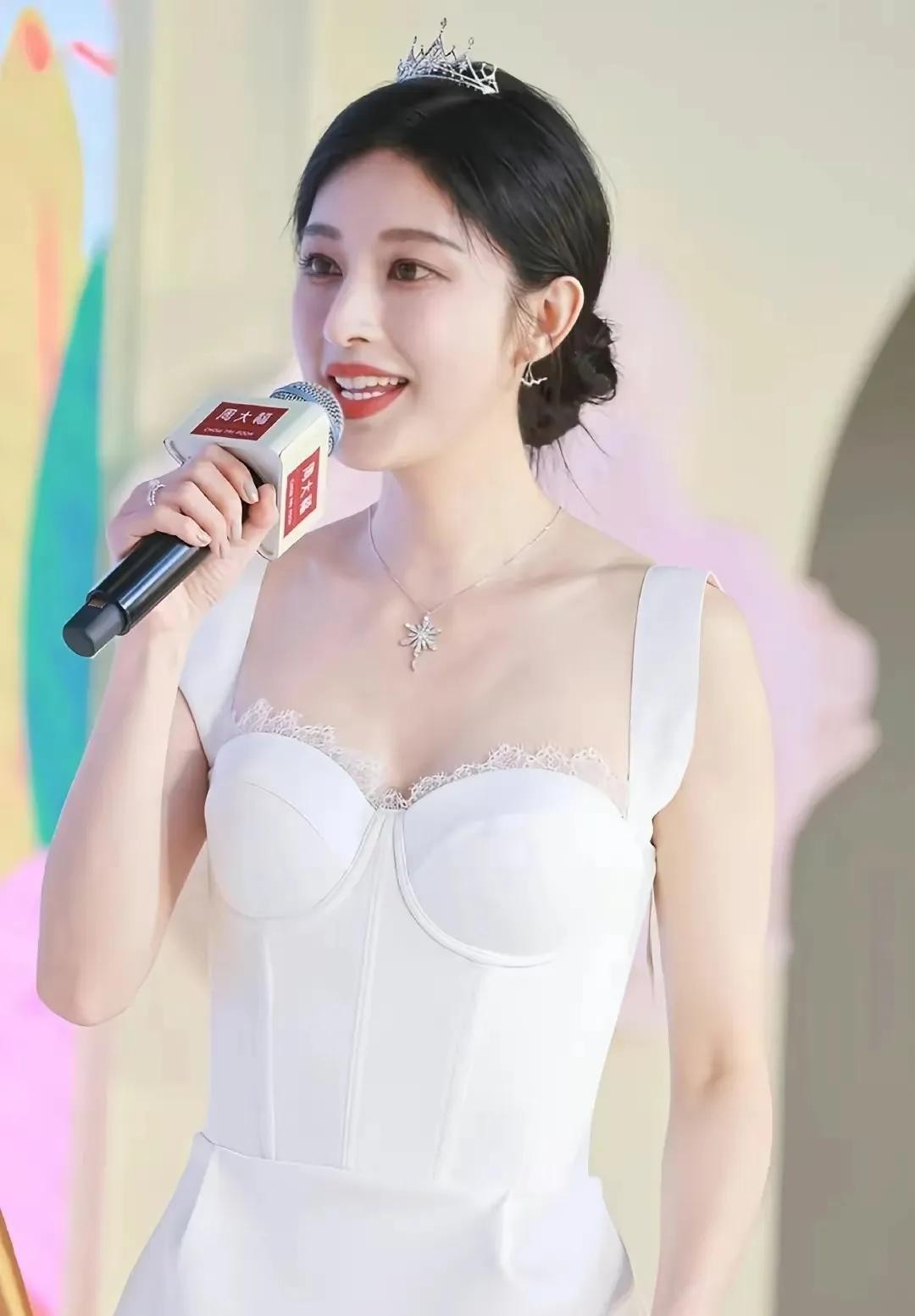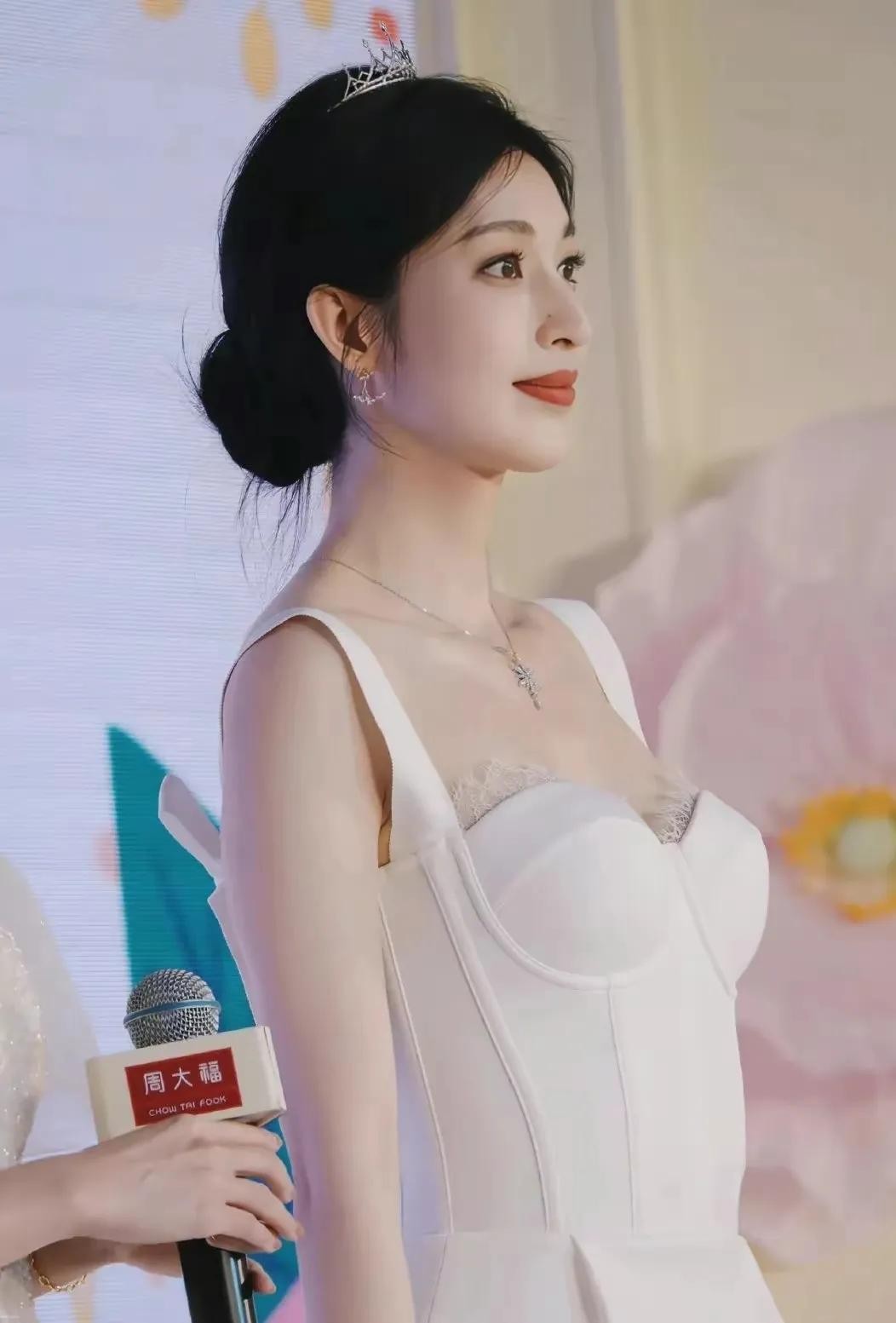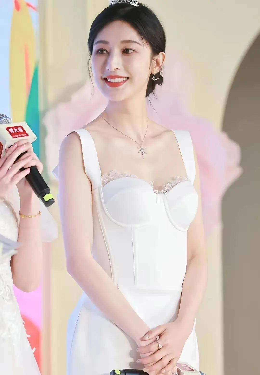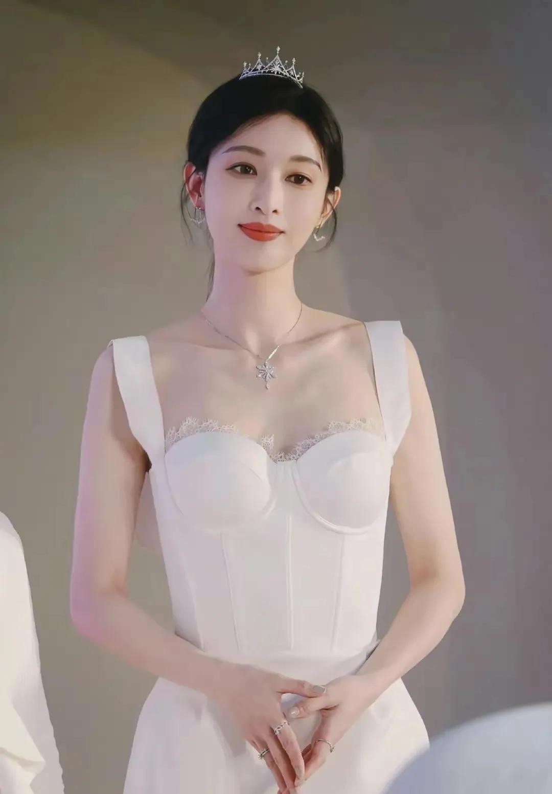 这身白色紧身礼服真是太赞了!简直就是她的战袍啊,紧身设计完美展现出她曼妙的身材曲线,还有那蕾丝装饰,简直就是仙女下凡般的存在!看着就让人心动不已。再看看她的发型和头饰,真的是简单而不失优雅。头发盘得高高的,露出她精致的五官,再配上那顶简单的头饰,简直是锦上添花,让人不得不佩服她的审美眼光。妆容方面就更不用说了,简直是完美到无可挑剔!看那唇色,鲜艳得就像刚吃过的樱桃,让人忍不住想亲一口。整个妆容既清新又自然,完美地突出了她的美丽。当然啦,最重要的还是她那张自信而优雅的脸。她正对着镜头微笑,那笑容简直就像阳光一样温暖人心。她的眼神里充满了自信和魅力,让人一看就被深深吸引住。